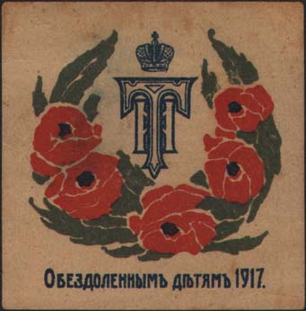 1917 г. Разм. 57 х 58 мм. Трехцветная печать на желтоватой бумаге. В центре в венке из маков эмблема комитета. Внизу текст в одну строку: «Обездоленным детям 1917».