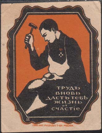 1916 г. 10.-11.05.1916 г. Разм. 49 х 63 мм. Двухцветная печать на сероватой бумаге. В центре в декоративной рамке сапожник-инвалид с Георгиевским крестом за работой. Справа внизу текст в шесть строк: «Труд вновь даст тебе жизнь и счастье». Слева внизу между рамками монограмма из букв «Я», «Т» и «А…