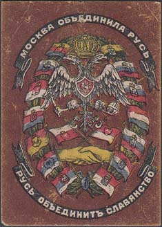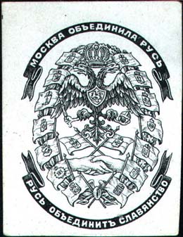 1914 г. Разм. 43 х 57 мм. Одноцветная печать на толстой желтоватой бумаге с мелованным верхним слоем. В центре эмблема попечительства: двуглавый орел и две руки, сцепленные в рукопожатии в обрамлении венка и флагов славянских государств. На ленте текст: «Москва объединила Русь, Русь объединит сла…