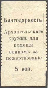 1914(?) г. Разм. 27 х 48 мм. Одноцветная печать на белой бумаге. Вертикальная зубц. 11 1/2. Текст в шесть строк: «Благодарность Архангельского кружка для помощи воинам за пожертвование». Внизу номинал.