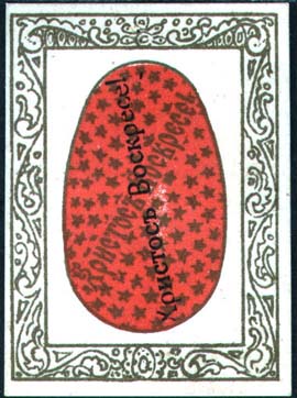 1914 г. 1915(?) г. Разм. рамки 40 х 56 мм. Трехцветная двухсторонняя печать на плотной белой бумаге. На лицевой стороне в декоративной рамке пасхальное яйцо. На яйце крест накрест две надписи: «Христос Воскресе!». На оборотной стороне текст в четыре строки: «На помощь жертвам войны. Москва, Марос…