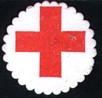 1914 г. 1915(?) г. Виньетка в виде круга диаметром 32 мм с фигурными краями. Одноцветная двухсторонняя печать на сероватой бумаге с мелованным верхним слоем. В центре знак Красного Креста. На оборотной стороне текст в пять строк: «На помощь жертвам войны. Москва, Маросейка, 14. Телефон 60-64».