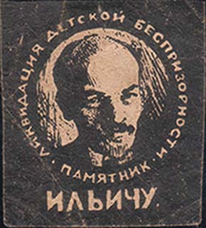 1930(?) г. Разм. 50 х 54 мм. Одноцветная печать на желто-ватой бумаге. В центре портрет В.И. Ленина. По окружности текст: «Ликвидация детской беспризорности памятник Ильичу.