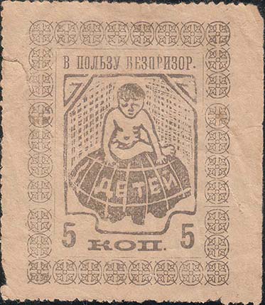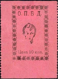 1930(?) г. Разм. 38 х 52 мм. Одноцветная печать на розовой бумаге. Нерегулярная зубцовка. В центре в декоративной прямоугольной рамке разм. 25 х 34 мм голова ребенка. Сверху аббревиатура «О.П.Б.Д.». Внизу номинал: «Цена 10 коп.».