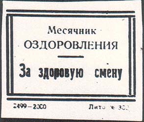 1930(?) г. Разм. 50 х 42 мм. Одноцветная(?) печать на белой(?) бумаге. В двойной прямоугольной рамке разм. 42 х 50 мм сверху текст в две строки: «Месячник оздоровления». В центре горизонтальная черта. Внизу текст: «За здоровую смену».