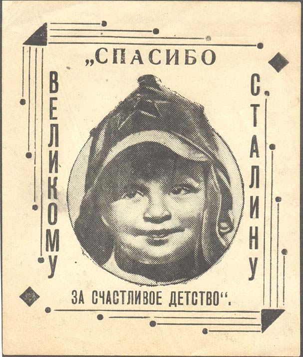 1932(?) г. Листок разм. 102 х 112 мм. Одноцветная печать на желтоватой бумаге. В центре в декоративной рамке круг диаметром 60 мм, в котором голова ребенка в буденовке. По периметру текст: ««Спасибо великому Сталину за счастливое детство»».