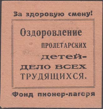 1932(?) г. Разм. 55 х 58 мм. Одноцветная печать на светло-желто-серой бумаге. В центре в двойной прямоугольной рамке разм. 45 х 37 мм тест в пять строк: "Оздоровление пролетарских детей - дело всех трудящихся". Сверху над рамкой текст: "За здоровую смену!". Внизу под рамкой текст: "Фонд пионер-ла…