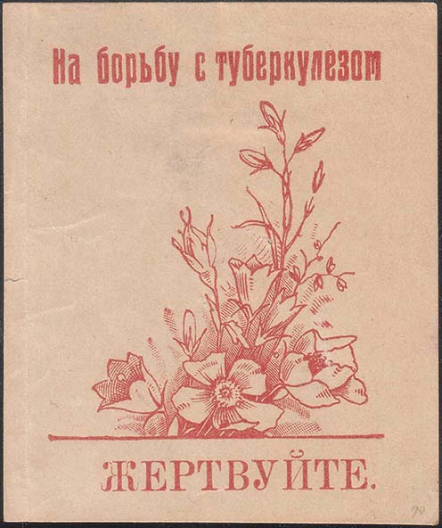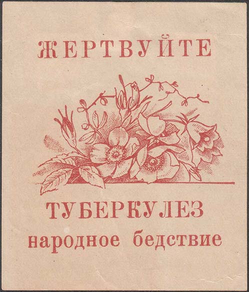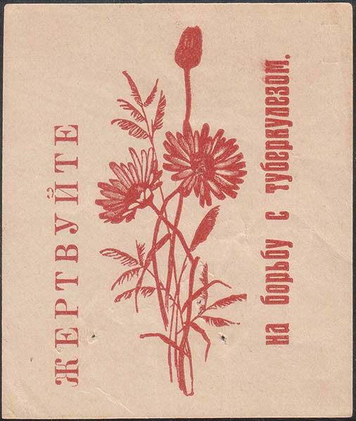 1930(?) г. Разм. 62 х 73 мм. Одноцветная печать на кремовой бумаге. В центре букет из различных полевых цветов. Сверху текст: «На борьбу с туберкулезом». Внизу продолжение текста: «Жертвуйте».