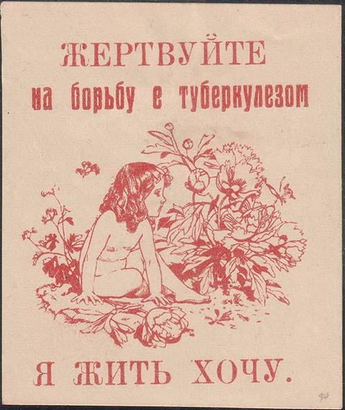 1930(?) г. Разм. 62 х 73 мм. Одноцветная печать на кремовой бумаге. В центре девочка, сидящая возле растущих цветов. Сверху текст в две строки: «Жертвуйте на борьбу с туберкулезом». Внизу текст: «Я жить хочу».