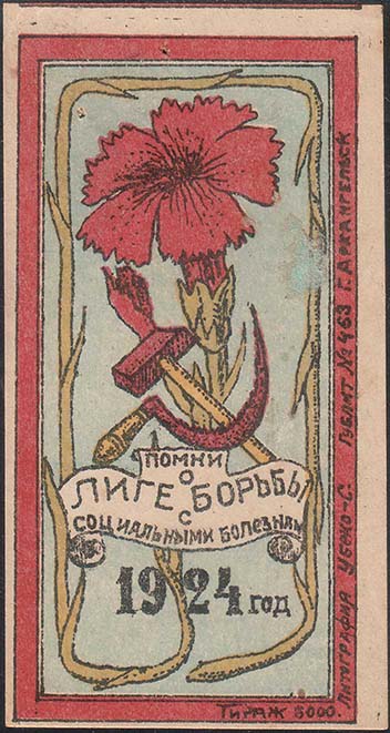1924 г. Разм. 44 х 82 мм. Многоцветная печать на плотной белой бумаге. В двойной прямоугольной рамке разм. 39 х 78 мм в центре цветок гвоздики, серпи и молот. В центре на картуше текст в пять строк: «Помни о Лиге Борьбы с социальными болезнями». Внизу дата: «1924 год». Внизу и слева между рамками…