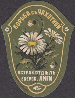 1913 г. Виньетка сложной формы в виде щитка разм. 40 х 52 мм. Трехцветная печать на белой бумаге. В центре в фигурной рамке букет цветов ромашки. Сверху полукругом текст: «Борьба с чахоткой». Внизу текст в две строки: «Астрах[анский]. отдел Всерос[сийской]. Лиги». Слева внизу с наружной стороны р…