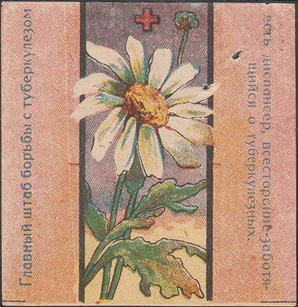 1925 г. 23.-25.05.1925 г. Разм. 60 х 62 мм. Многоцветная печать на белой бумаге. В центре в двойной вертикальной рамке цветок ромашки. Сверху красный крест. Слева и справа вертикально текст: «Главный штаб борьбы с туберкулезом есть диспансер, всесторонне заботящийся о туберкулезных».