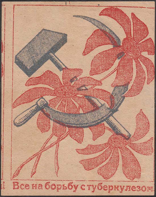 1925(?) г. Разм. 68 х 87 мм. Двухцветная печать на кремовой бумаге. В прямоугольной рамке разм. 65 х 77 мм скрещенные серп и молот и три цветка ромашки. Внизу под рамкой текст: «Все на борьбу с туберкулезом».