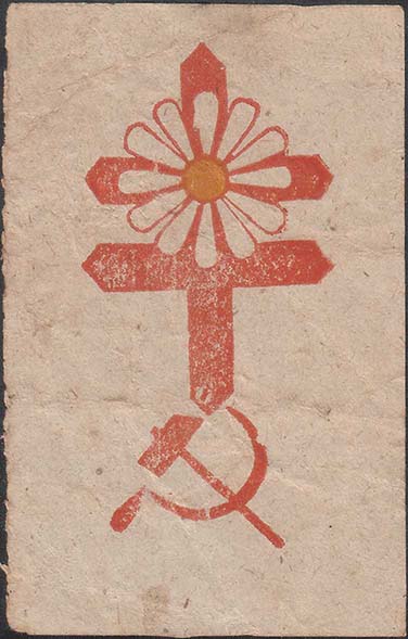 1925(?) г. Разм. 47 х 74 мм. Двухцветная печать на серо-ватой бумаге низкого качества. В центре цветок ромашки на фоне шестиконечного креста. Внизу серп и молот.