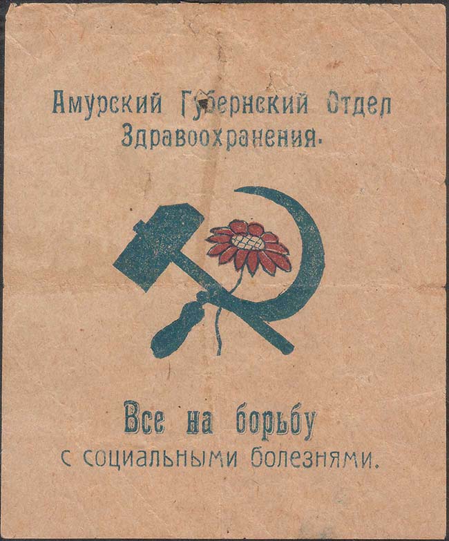 1928(?) г. Разм. 82 х 98 мм. Двухцветная печать на желтоватой бумаге. В центре скрещенные цветок, серп и молот. Сверху текст в две строки: «Амурский Губернский Отдел Здравоохранения». Внизу текст в две строки: «Все на борьбу с социальными болезнями».