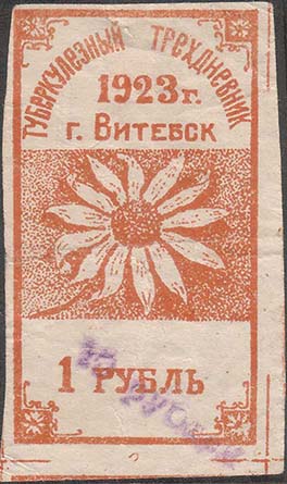 1923 г. Разм. 33 х 54 мм. Одноцветная печать на тонкой белой бумаге. В прямоугольной рамке разм. 28,5 х 50 мм с орнаментом по углам в центре на сплошном фоне цветок ромашки. Сверху текст в три строки: «Туберкулезный трехдневник 1923 г. г. Витебск». Внизу номинал. Внизу по диагонали фиолетовый отт…