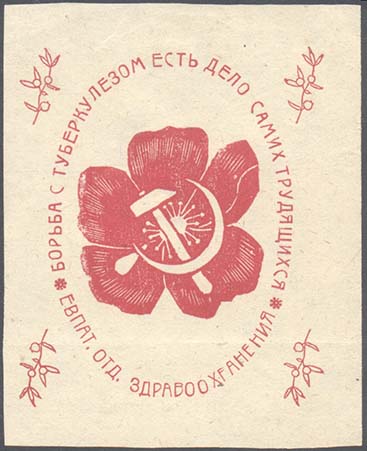 1930(?) г. Разм. 60 х 75 мм. Одноцветная печать на кремовой бумаге. В центре серп и молот на фоне цветка мака. По окружности текст: «Борьба с туберкулезом есть дело самих трудящихся. Евпат[орийский]. Отд[ел]. здравоохранения». По углам растительный орнамент.