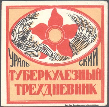 1925 г. Разм. рамки 55 х 55 мм. Трехцветная печать на белой бумаге. Сверху в двойной овальной рамке цветок мака в обрамлении снопа серпа и молота и оливковой ветви. Внизу текст в три строки: «Уральский туберкулезный трехдневник». Справа внизу под рамкой выходные данные мелким шрифтом: «Лит. Акц. …