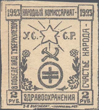 1923 г. 07.1923 г. Разм. 54 х 88 мм. Многоцветная печать на белой бумаге. В центре Лотарингский крест и серп и молот в обрамлении венка из трех ромашек. Внизу полукругом текст: «На борьбу с чахоткой». Справа в углу дата: «VII-1923 г.». По углам разграничительные линии.