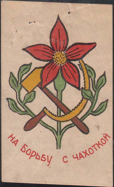 1924 г. Разм. 48 х 78 мм. Многоцветная печать на плотной белой бумаге. В центре цветок мака и скрещенные серп и молот. Внизу полукругом текст: «На борьбу с чахоткой».