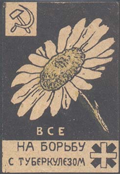 1922 г. 17.-24.-09.1922 г. Разм. 40 х 59 мм. Двухцветная печать на желтоватой бумаге. В центре на сплошном фоне цветок ромашки. В левом верхнем углу в прямоугольной рамке серп и молот. Внизу текст в три строки: «Все на борьбу с туберкулезом». В правом нижнем углу эмблема из двух четырехконечных кр…