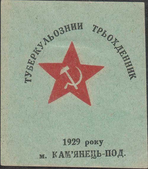 1929 г. Разм. 66 х 84 мм. Двухцветная печать на зелено-серой бумаге. В центре пятиконечная звезда с серпом и молотом. Сверху полукругом текст на украинском языке: «Туберкулезный трехдневник». Внизу текст в две строки на украинском языке: «1929 год г. Каменец-Под[ольский].».