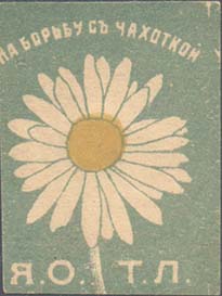 1916(?) г. Разм. 35 х 46 мм. Двухцветная печать на желтоватой бумаге. В центре цветок ромашки. Сверху полукругом текст: «На борьбу с чахоткой». Внизу аббревиатура: «Я.О.Т.Л.».