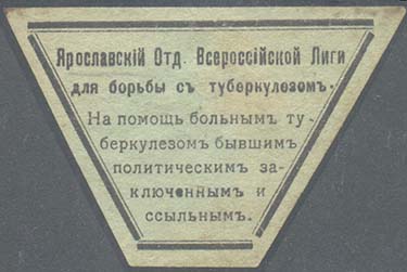 1917(?) г. Виньетка в форме перевернутой трапеции разм. 63 х 41 мм. Одноцветная печать на серо-зеленоватой бумаге. В двойной рамке в форме перевернутой трапеции разм. 54 х 35,5 мм текст в семь строк: «Ярославский Отд[ел]. Всероссийской Лиги для борьбы с туберкулезом. На помощь больным туберкулезо…