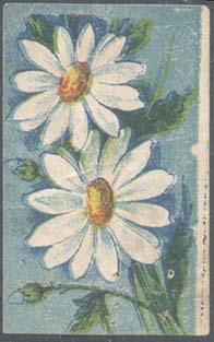 1915(?) г. Разм 32 х 52 мм. Многоцветная печать на белой бумаге. В центре два цветка ромашки с бутонами.