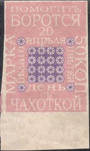 1917(?) г. Разм. рис. 28 х 38 мм. Двухцветная печать на белой бумаге. В центре на сплошном фоне геометрический орнамент из стилизованных цветков ромашки. По наружному периметру орнамента текст: «20 апреля день Белого Цветка». Сверху текст в две строки: «Помогите бороться». Внизу продолжение текст…