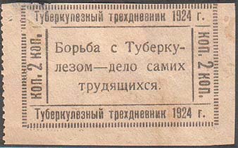 1924 г. Листок из квитанционной книжки разм. рамки 40 х 29 мм. Одноцветная печать на желтоватой бумаге. Левосторонняя нерегулярная зубц. В двойной прямоугольной рамке текст в три строки: «Борьба с Туберкулезом – дело самих трудящихся». Сверху и снизу между рамками текст: «Туберкулезный трехдневни…