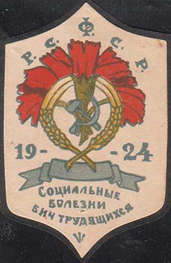 1924 г. Виньетка в виде щитка сложной формы разм. 40 х 62 мм. Трехцветная печать на толстой белой бумаге. В центре серп и молот в обрамлении венка из гвоздик и колосьев пшеницы. Внизу лента и дата: «1924». Сверху аббревиатура «Р.С.Ф.С.Р.». Внизу текст в три строки: «Социальные болезни - бич трудя…