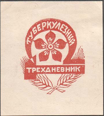 1925(?) г. Разм. 60 х 66 мм. Одноцветная печать на белой бумаге. В центре стилизованное изображение цветка мака и серпа и молота. Внизу два колоса ржи. Текст: «Туберкулезный трехдневник».
