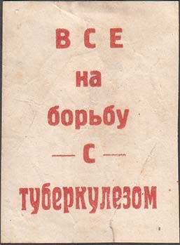 1925(?) г. Разм. 44 х 57 мм. Одноцветная печать на плотной белой бумаге. В центре текст в четыре строки: «Все на борьбу с туберкулезом».