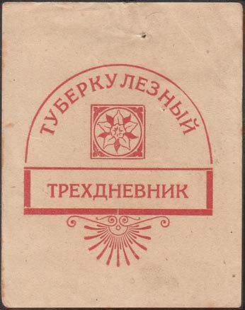1925(?) г. Разм. 58 х 74 мм. Одноцветная печать на плотной белой бумаге. В центре в прямоугольной рамке текст: «Трехдневник». Сверху декоративный элемент полукругом и текст: «Туберкулезный». Внизу декоративный элемент.