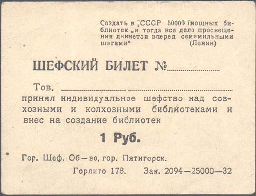 1932(?) г. Разм. 87 х 66 мм. Одноцветная печать на желтоватой бумаге. В центре текст в шесть строк: «Шефский билет №...Тов. ... принял индивидуальное шефство над совхозными и колхозными библиотеками и внес на создание библиотек 1 Руб.». В правом верхнем углу текст в четыре строки: «Создать в СССР…