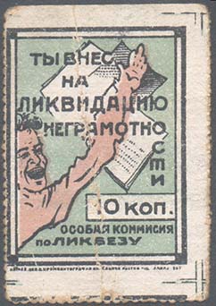 1930(?) г. Разм. рамки 34 х 45 мм. Трехцветная печать на желтоватой бумаге с мелованным верхним слоем. В центре в двойной прямоугольной рамке человек с вытянутой левой рукой на фоне открытых книг и тетрадей. Поверх рисунка текст в четыре строки: «Ты внес на ликвидацию неграмотности». Справа внизу…