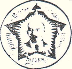 1931 г. 19.05.1931 г. Разм. 42 х 38 мм. Одноцветная печать на желтоватой бумаге. В центре стилизованное изображение раскрытой книги, на развороте ко-торой текст в три строки: «Книга на борьбу за пятилетку».