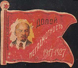 1927(?) г. Виньетка в виде флажка сложной формы разм. 50 х 37 мм. Трехцветная печать на толстой рыхлой желтоватой бумаге. Слева портрет В.И.Ленина. Справа текст в три строки: «Долой неграмотность 1917 -1927». Слева вертикально выходные данные мелким шрифтом: «1-ая Госхромолит. ДПБ Р н/Д З. №281. …