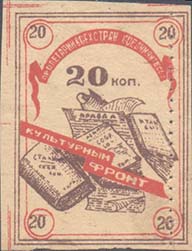 1932 г. Разм. рамки 29 х 39 мм. Двухцветная печать на желтоватой бумаге. Нерегулярная зубц. В центре в тройной прямоугольной рамке книги и газеты. По диагонали на ленте текст в две строки: «Культурный фронт». Сверху номинал и лента с текстом: «Пролетарии всех стран соединяйтесь!». По углам внутре…