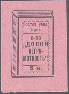 1931 г. Разм. 36 х 49 мм. Одноцветная печать на бумаге различных цветов. В центре в рамке в виде книге разм. 22,5 х 36 мм в центре текст в четыре строки: «О-во «Долой неграмотность»». Сверху текст в две строки: «Ростов[ский]. Уезд[ный]. Отдел». Внизу номинал.