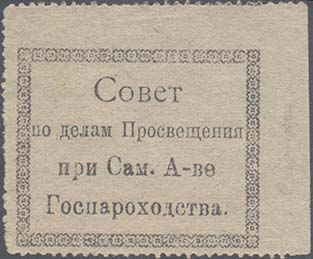 1930(?) г. Одноцветная двухсторонняя печать на зелено-серой бумаге. Зубц. 11 1/2. На лицевой стороне в прямоугольной декоративной рамке разм. 41 х 33,5 мм текст в четыре строки: «Совет по делам Просвещения при Сам[арском]. А[гентст]-ве Госпараходства». На оборотной стороне в прямоугольной декорат…