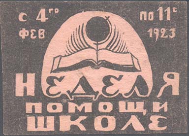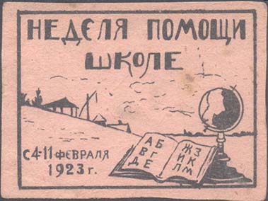 1923 г. 04.-11.02.1923 г. Разм. 64 х 45 мм. Одноцветная печать на кремовой бумаге. В центре в декоративной рамке открытая книга и глобус. Сверху текст в две строки: «С 4-го по 11-е фев[раля]. 1923». Внизу текст в три строки: «Неделя помощи школе».