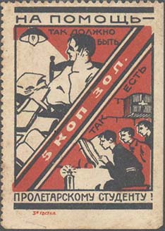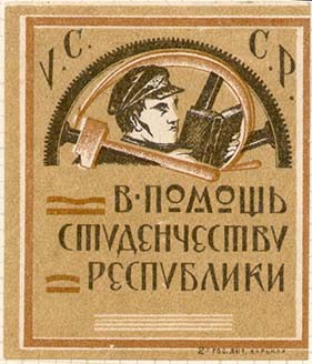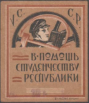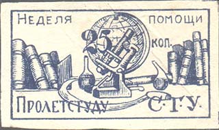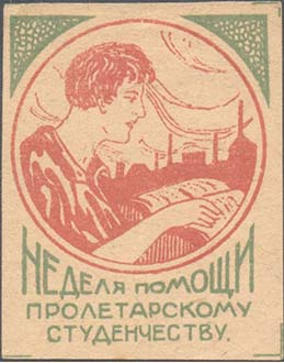 1925(?) г. Разм. 42 х 54 мм. Двухцветная печать на желто-серой бумаге. В центре в круглой рамке диаметром 38 мм студент, читающий книгу на фоне городского пейзажа. Внизу текст в три строки: «Неделя помощи пролетарскому студенчеству».
