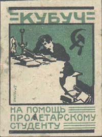 1925 г. Разм. 33 х 46 мм. Двухцветная печать на белой бумаге. В прямоугольной рамке студент за книгами. Справа сверху серп и молот. Сверху аббревиатура «КУБУЧ». Внизу текст в три строки: «На помощь пролетарскому студенту». Слева внизу вертикально мелким шрифтом выходные данные: «3-я гостип».