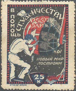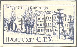 1925 г. Разм. 54 х 30 мм. Одноцветная печать на белой бумаге. В прямоугольной рамке разм. 26 х 49 мм в центре глобус, микроскоп, книги и серп и мо-лот. Сверху текст: «Неделя помощи». Внизу продолжение текста: «Пролетстуду С.Г.У.». В центре номинал.