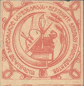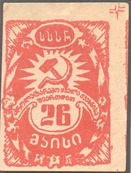 1925(?) г. Разм. 43 х 57 мм. Одноцветная печать на желтоватой бумаге. В центре в декоративной рамке серп и молот. Внизу цифра 26. Тексты на грузинском языке.