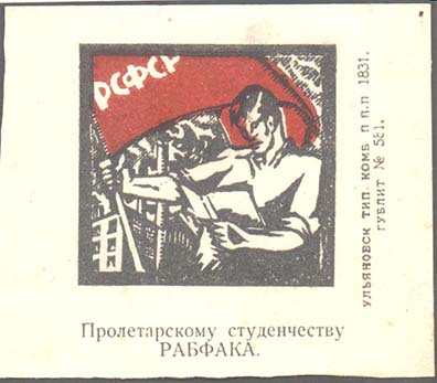 1925(?) г. Разм. 57 х 66 мм. Двухцветная печать на плотной белой глянцевой бумаге. В толстой рамке разм. 36 х 39 мм в центре рабочий с книгой со знаменем с аббревиатурой «РСФСР» на фоне завода. Внизу под рамкой текст в две строки: «Пролетарскому студенчеству РАБФАКа».