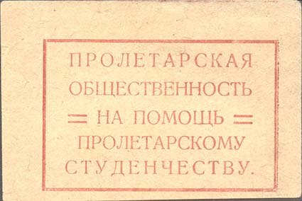 1925(?) г. Разм. 71 х 48 мм. Одноцветная печать на светло-желтой бумаге. В прямоугольной рамке разм. 56 х 36 мм текст в пять строк: «Пролетарская общественность на помощь пролетарскому студенчеству».