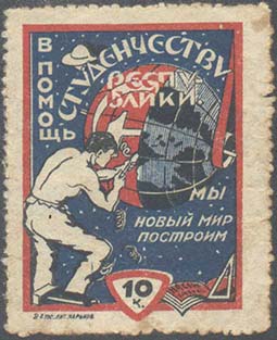1925 г. Разм. 54 х 30 мм. Одноцветная печать на белой бумаге. В прямоугольной рамке разм. 26 х 49 мм улица с трехэтажное здание, телеграфный столб и деревьями. Сверху текст: «Неделя помощи». Внизу продолжение текста: «Пролетстуду С.Г.У.». Слева в центре номинал.